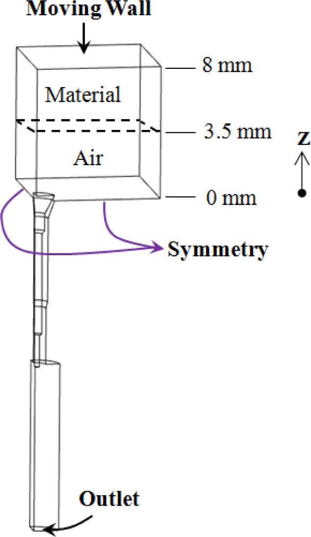 일부분에 재료가 가득 차 있는 초기 조건을 구현하기 위해서 Z좌표계 3.5~8 mm 영역에서 고무의 부피 체적율을 100%로 정의하였으며 이외의 영역(0~3.5 mm)은 공기영역으로 정의했다(Figure 5).