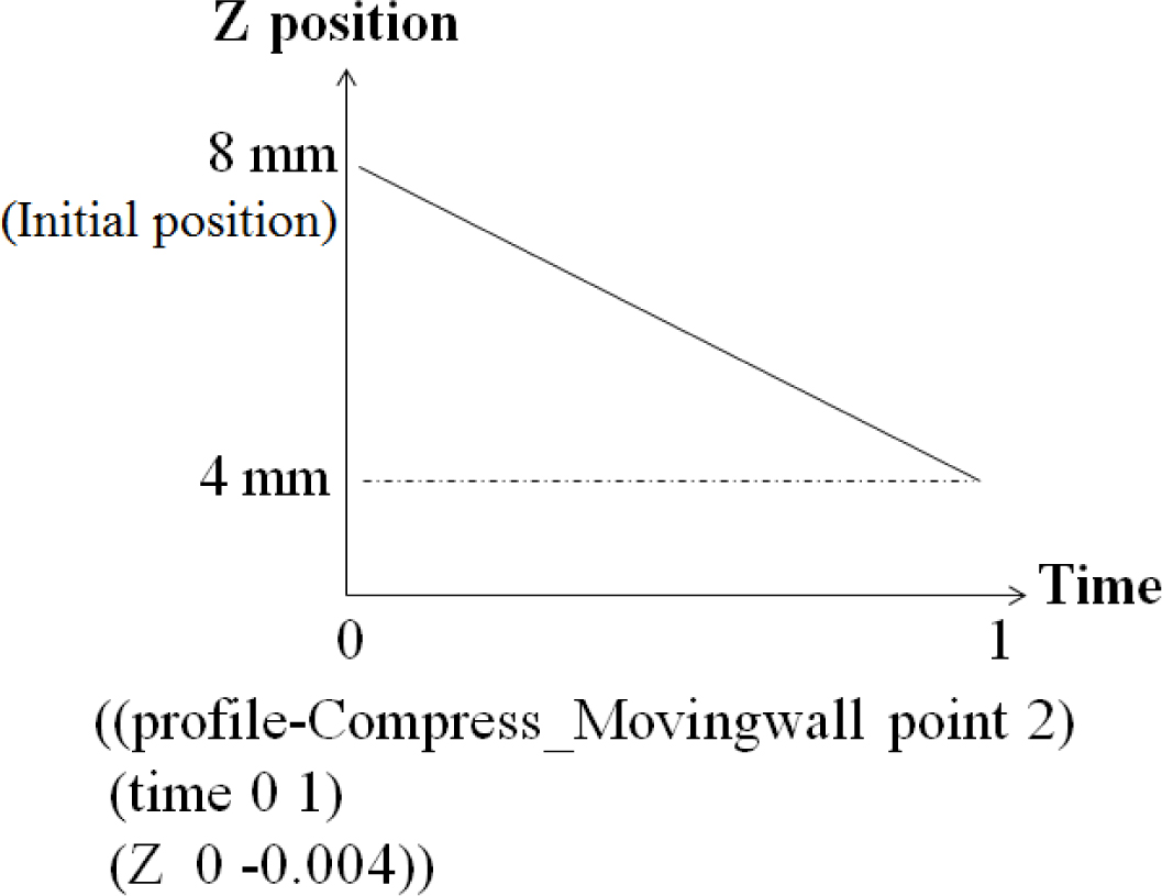 해석모델의 윗 부분인 moving wall에 적용한 시간에 따른 위치 profile 구문을 나타냈으며 4 mm의 거리를 일정한 속도로 아래방향(-Z 방향)으로 내려오게 작성했다. 시간이 지남에 따라서