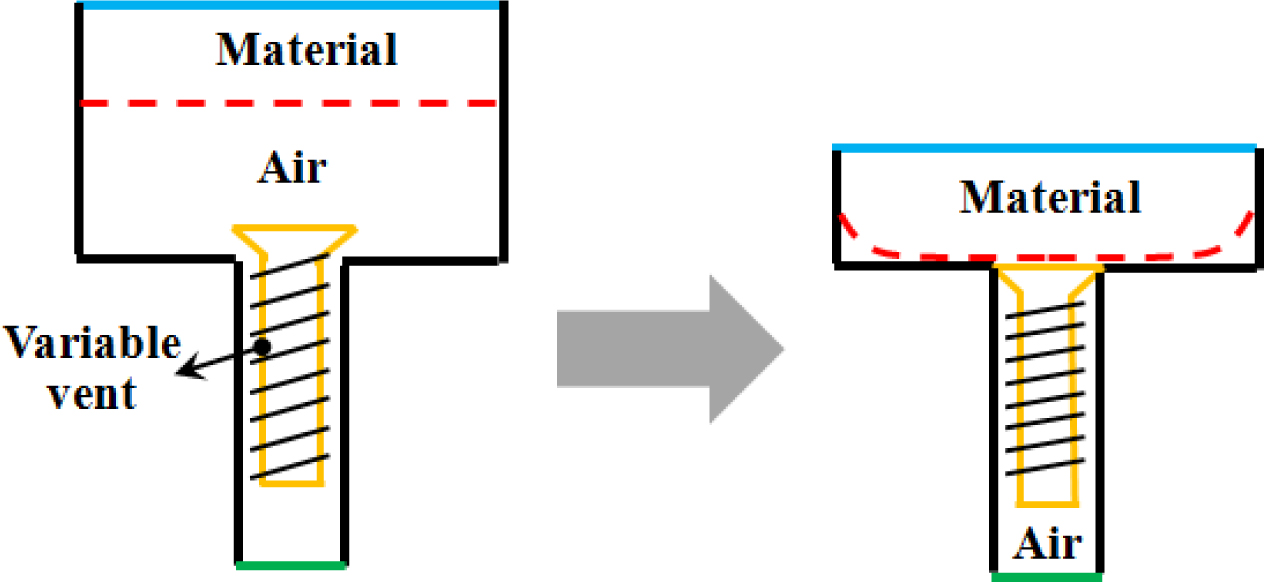 갖는 캐비티의 윗쪽에 있던 고무가 아래방향(-Z방향)으로 내려오고 공기가 재료에 밀려서 벤팅 홀을 따라 빠져나가는 현상을 관찰하고자 했다. 고무의