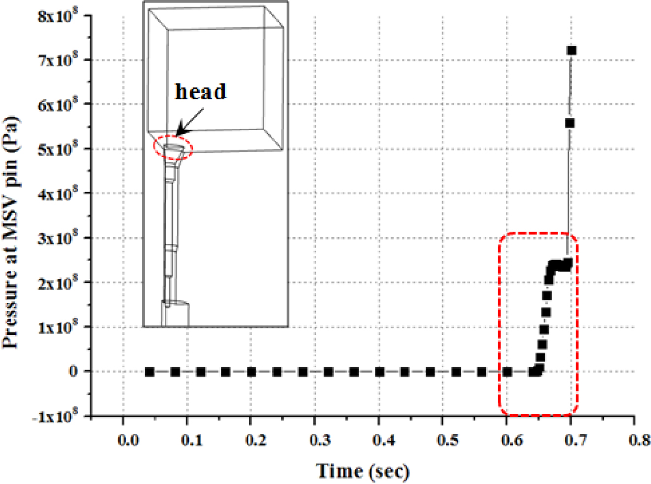 Figure 9 Simulation results of the pressure at the head of the pin according to time. |