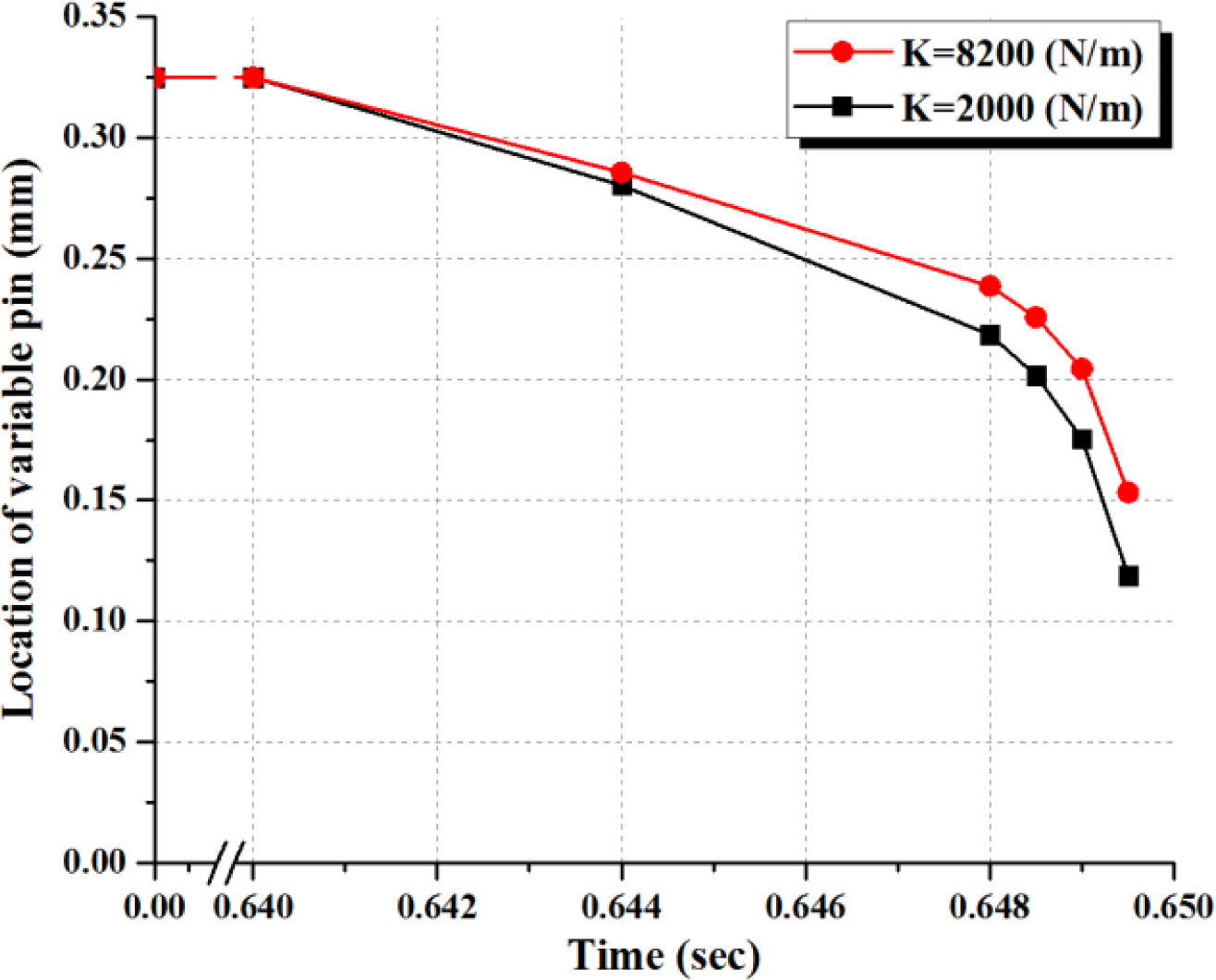 Figure 10에 벤트핀 머리부의 시간에 따른 위치(Z 좌표계) 를 나타냈다. 0~0.6초에서 고정된 벤트핀의 위치는 초기 돌출 높이인 0.325 mm이며 벤팅 영역이 열려 있는 상태다. 0.64초부터 재료의 누름에 의해 벤트핀의 위치는 시간에 따라 낮아지고 점차 닫히게 된다. 0.6495초에서 스프링 강성이 2000 N/m일 때 벤트 구조물의 닫힘 정도는 약 63% 정도이며, 스프링 강성이 8000 N/m일 때는 약 53%로 스프링 강성이 작은 경우에 더 많이 닫히게 된다. 벤팅 홀이 완전히 닫히기 직전(0.650초가 되기 전)에 해석은 종료된다.