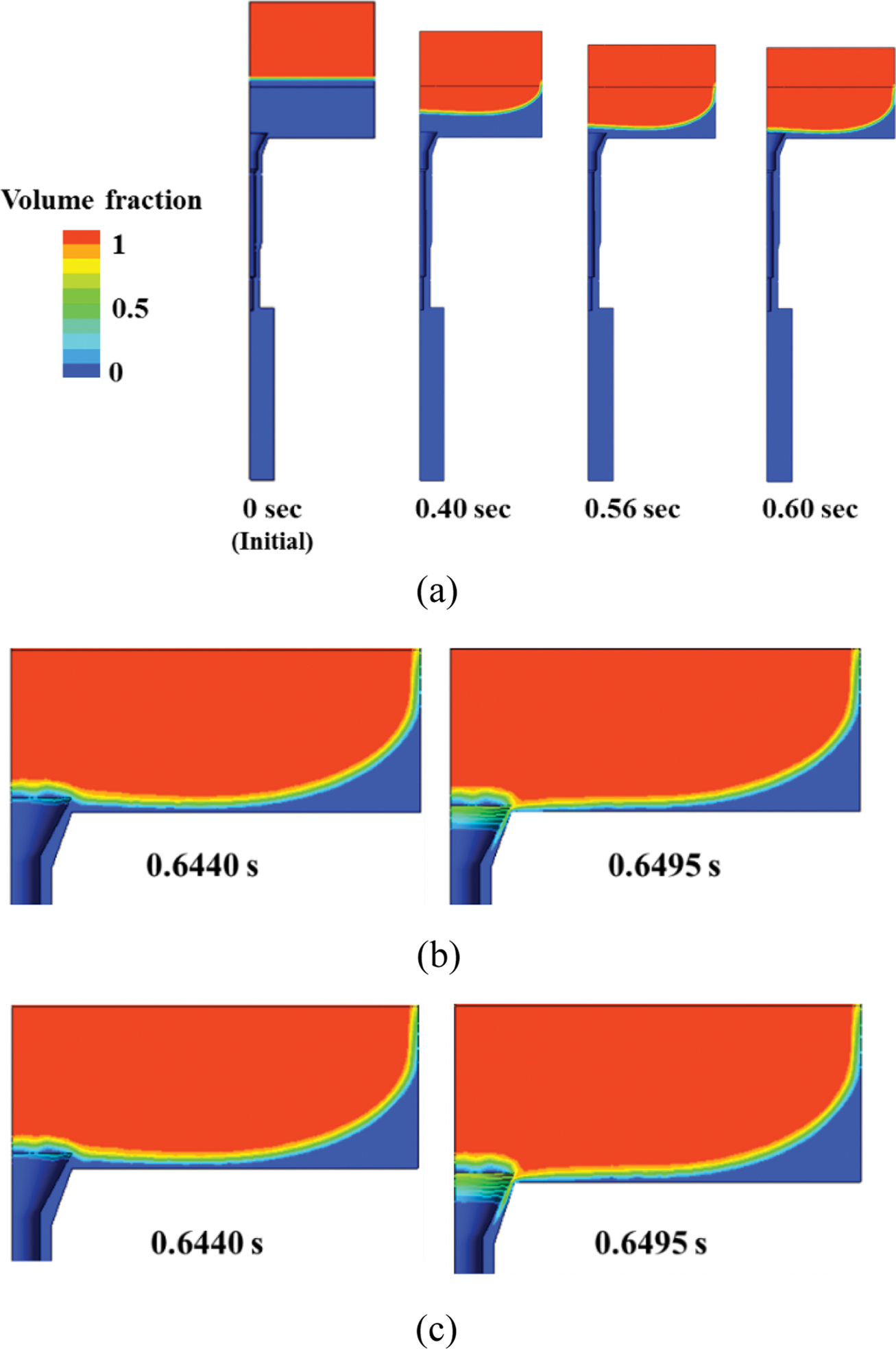 Figure 11 Simulation results for the interface between the material and air according to time: (a) during 0~0.6 sec for spring constant of 2000 N/m; (b) spring constant of 2000 N/m; (c) spring constant of 8200 N/m. |