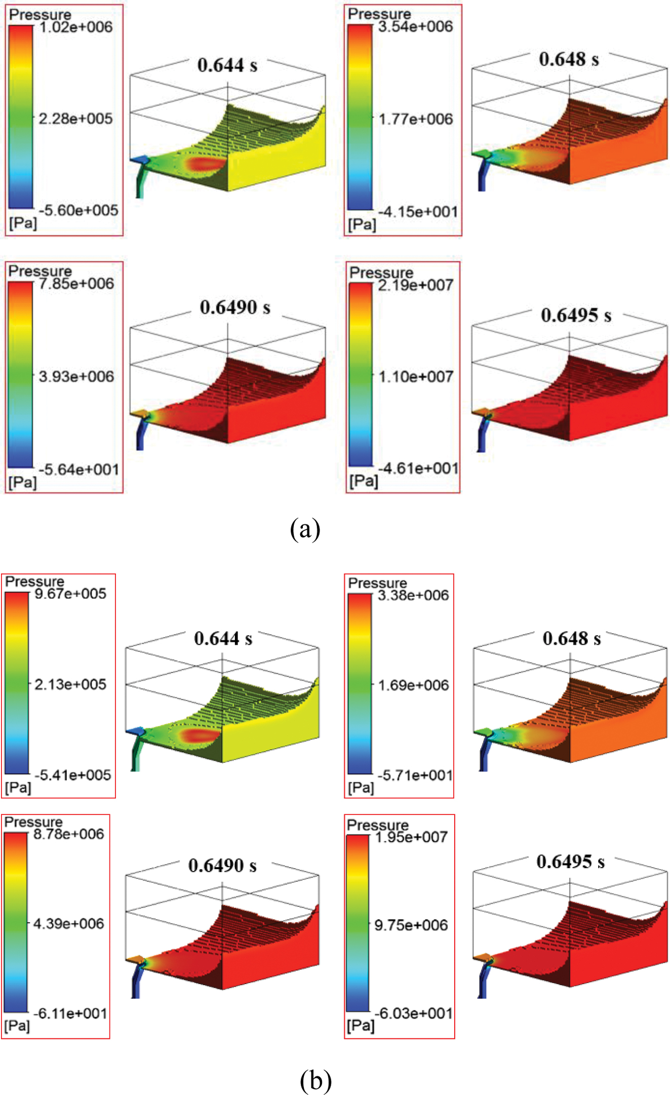 Figure 12 Pressure distribution of air according to time for various spring constants: (a) spring constant of 2000 N/m; (b) spring constant of 8200 N/m. |