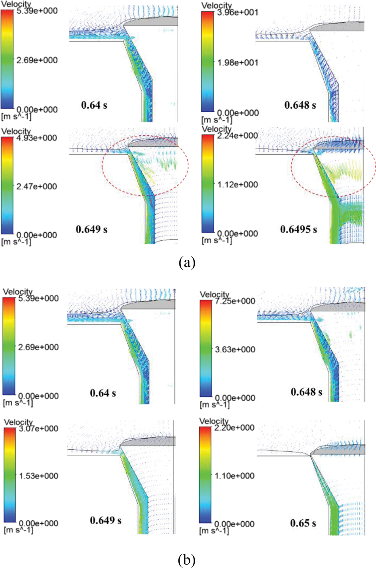 0~5.39 m/sec로 벤팅 속도가 분포하고 0.648초에서는 0~7.25 m/sec로 벤팅 속도가 나타났다. 0.649초에서는 0~3.07 m/sec로 벤팅 속도가 분포하고 0.65초에서는