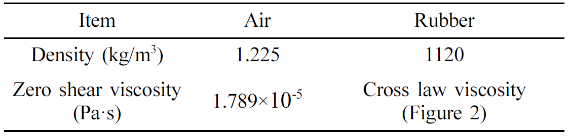 밀도와 점성계수이다. 해석에 사용된 공기와 고분자재료의 물성이 Table 1에 나타나 있다.