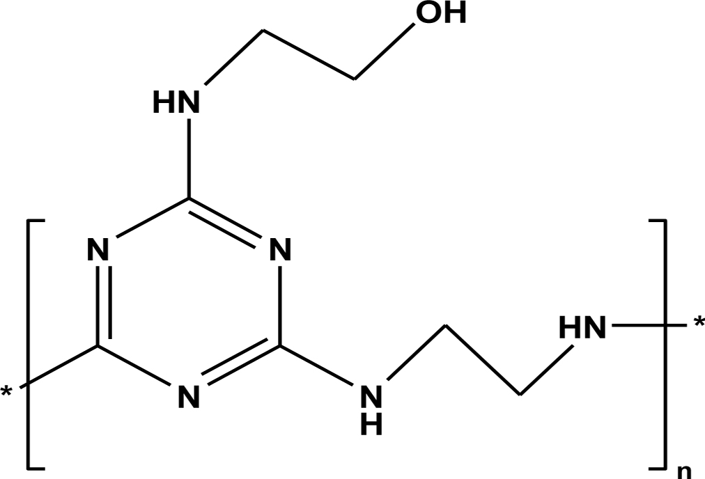 From the past few years, a new flame retardant coating system using intumescent flame retardant (IFR) has been developed and recognized as environmentally friendly. IFR system majorly consists of three compounds such as (1) an acid source, (2) carbon source, and (3) blowing agent.19 To prepare IFR systems ammonium polyphosphate (APP), pentaerythritol (PER), and melamine (MEL) have been used as the acid source, carbonizing agent, and blowing agent respectively. While burning, IFR (APP+PER+MEL) components involved in a dehydration reaction to form a double bond (C=N) contained poor protective char with a foam structure which blocks fire spread. The PER carbon source does not bring that much of satisfactory results as it is a small molecule. PER is hygroscopic, so atmospheric moisture can easily attack it and the IFR system is corrosive. To solve this problem, researchers made great trials to develop a polymer which shows both charring and foaming agent (CFA) properties. Some researchers made a different kind of CFA polymers from 1, 3, 5-triazine as a starting molecule and their efficiencies were well evaluated.20 It is already reported that CFA polymers containing tertiary nitrogen in their structure had shown good thermal stability.21 New IFR systems have been found with CFA combination. The synergistic actions of some molecules like zeolite22,23 and some transition metal oxides24,25 have been examined.