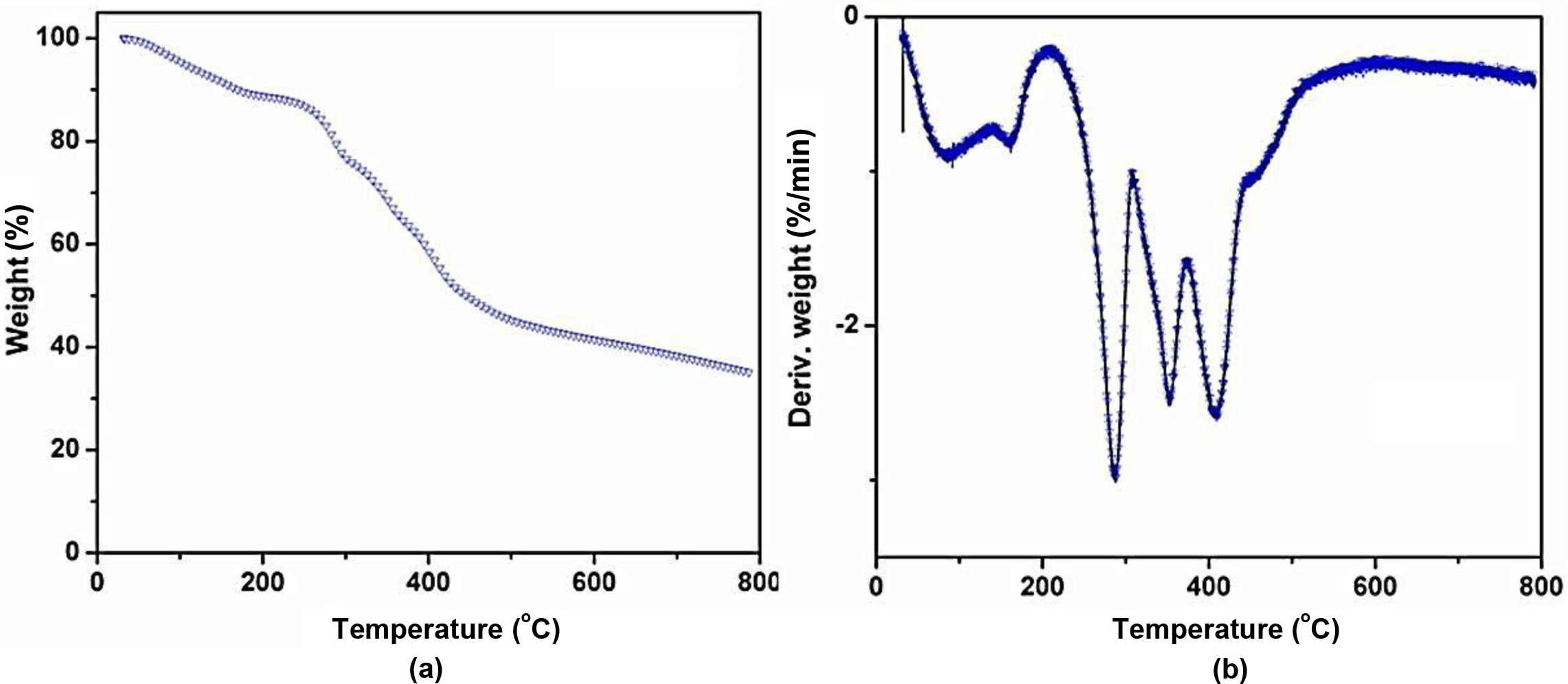(a) TGA of CFA polymer; (b) DTG of CFA polymer.
