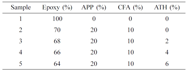 Preparation of Coatings. To prepare coating samples, epoxy (binder), APP, and CFA were used as an IFR system and Al(OH)3 as a synergistic agent. The ratio of APP to CFA was set at 2:1 w/w ratio and the loading content of Al(OH)3 was varied. For the preparation of coatings, APP, CFA, and aluminum tri-hydroxide were mixed in a dispersion mixer for 3 h. Then this mixture was mixed in a solution of resin and hardener (2:1) w/w ratio and applied on the plywood pieces of different dimensions for analysis purpose. The coatings were applied on plywood with a paint brush at room temperature for two times with 3 h intervals. After, the plywood sheets were dried at room temperature for two days in the ventilated condition. The thickness of the coating on plywood was measured to 1.5±0.2 mm by an Elcometer (model A456, USA). The compositions of the coating are shown in Table 1.