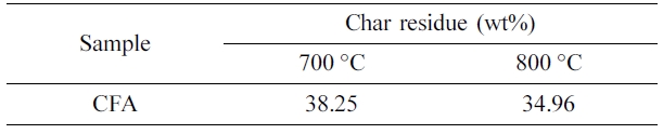 Thermal Degradation Pattern of CFA. TGA is a well-known technique for the evaluation of thermal stability and thermal degradation pattern of a compound. The thermograms (TGA and DTG) of CFA under nitrogen atmosphere are shown in Figure 3 and Table 3. From these data, it can be observed that CFA is thermally stable at a higher temperature. The char residue percentage of the CFA at 700 oC and 800 oC are 38.25 and 34.96% respectively. The CFA polymer initially showed thermal degradation at around 70 oC due to the evaporation of solvent residue (acetone and water). It is also seen that CFA shows three major steps of thermal degradation at temperature ranges of 260 to 310 oC, 315 to 375 oC, and from 380 to 440 oC respectively. The degradation of CFA both at 260 to 310 oC and 315 to 375 oC temperatures may be due to the dehydration and the loss of ammonia from the CFA molecule. The weight loss of CFA at third degradation stage (380 to 440 oC) is due to the breakage of macromolecular backbone structure which results in the release of ammonia and finally forms a char layer. This indicates that the prepared CFA acts as a charring and foaming agent at high temperatures.
