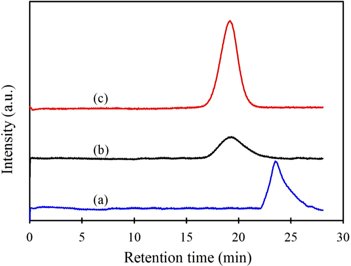 Figure 2 GPC chromatograms of (a) PLA; (b) CA; (c) CA-g(38.4)-PLA. |