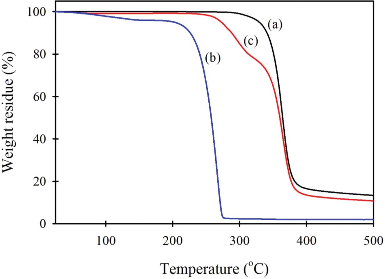 Figure 3 TGA curves of (a) CA; (b) PLA; (c) CA-g(34.4)-PLA. |