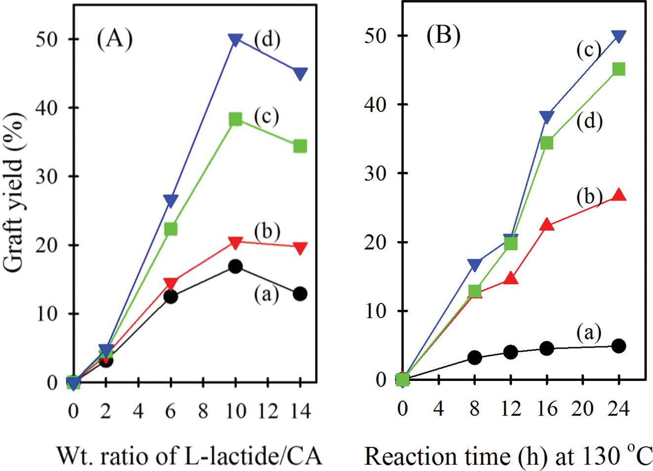 Figure 4 Changes in the graft yields of CA-g-PLA obtained by TGA analysis (A) with increasing weight ratio of L-lactide to CA; (B) with increasing reaction time at 130 °C. (A) Reaction time at 130 °C: (a) 8 h; (b) 12 h; (c) 16 h; (d) 24 h; (B) weight ratio of L-lactide to CA: (a) 2:1; (b) 6:1; (c) 10:1; (d) 14:1. |