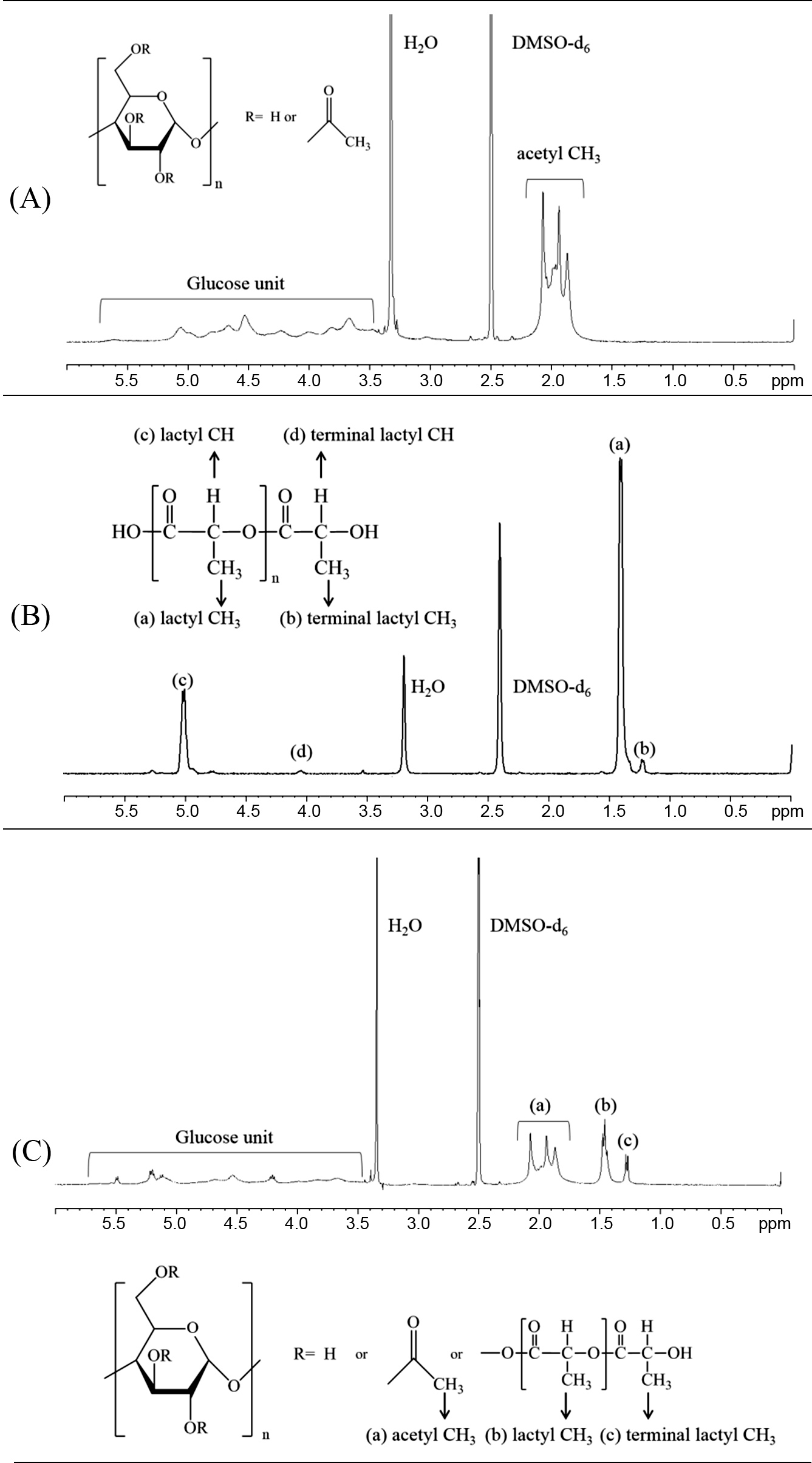 1H NMR을 사용한 CA-g-PLA의 그래프트율 분석. Figure 5(A), (B), (C)는 각각 CA, 호모 PLA, CA-g(38.4)-PLA의 1H