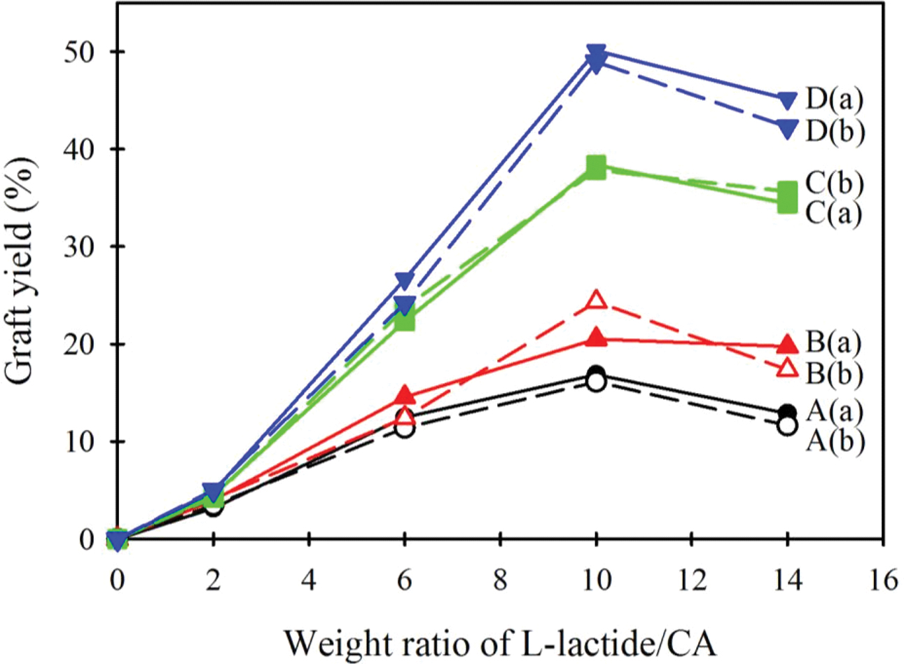 graft yields were synthesized by varying the weight ratio of L-lactide