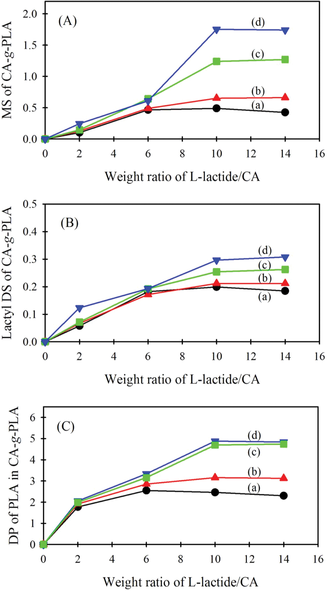 graft yield of CA-g-PLA increased with increasing the weight ratio of L-lactide