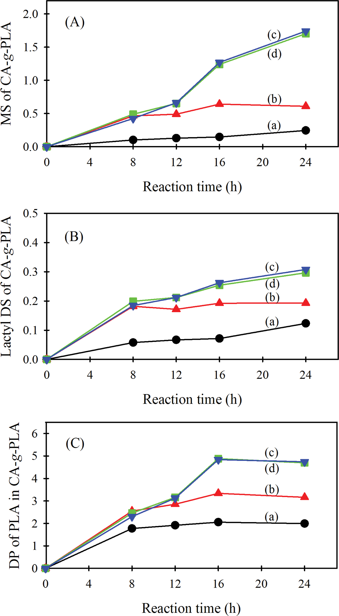 CA-g-PLA의 몰 치환도, 락틸 치환도, 그래프트된 PLA 가지사슬의 중합도 변화를 각각 Figure 9(A), (B), (C)에 나타내었다. 반응 시간 16시간 이후부터는 몰
