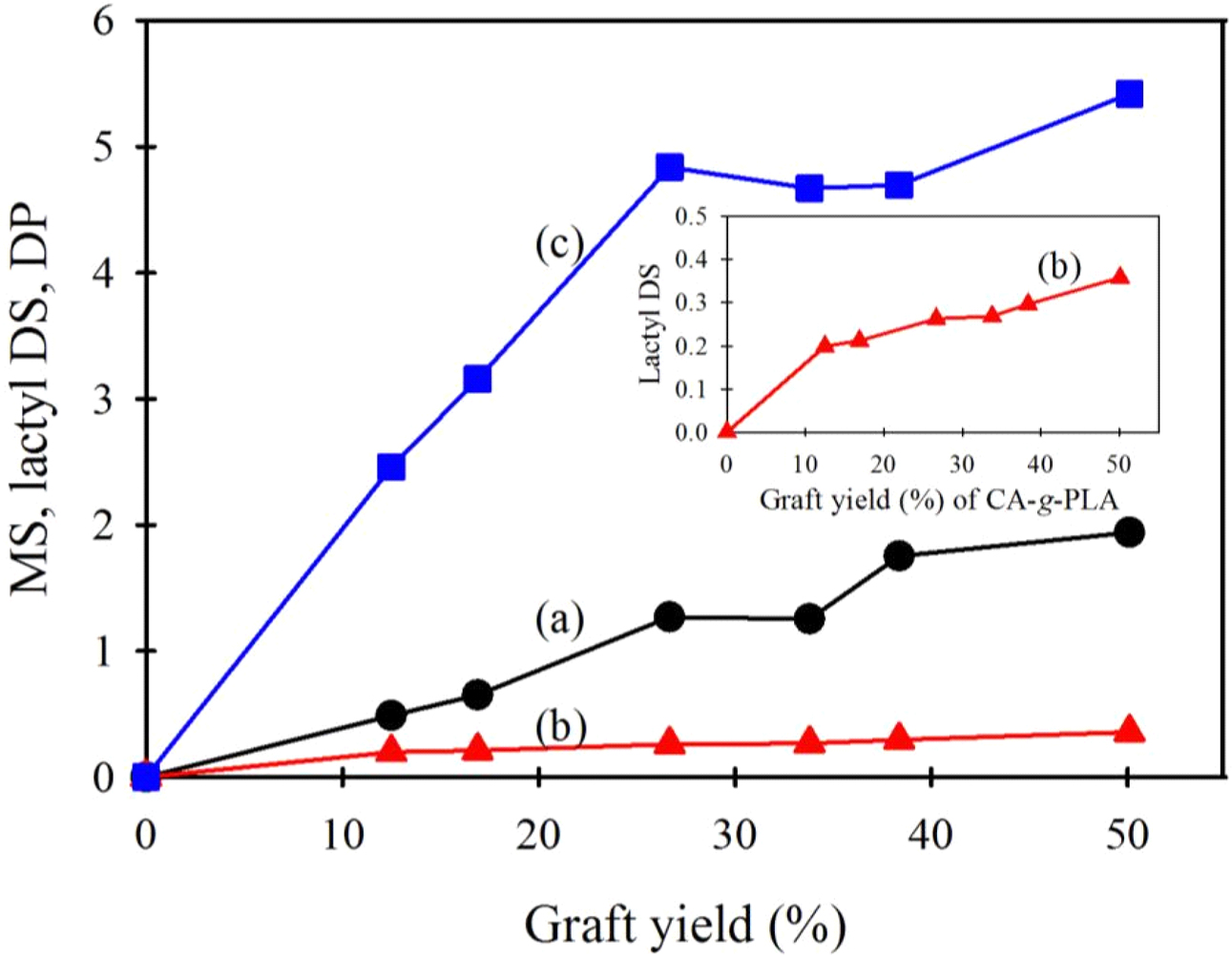 Figure 10 Increases in (a) mol substitution (MS); (b) lactyl DS; (b) DP of PLA in CA-g-PLA with increasing graft yield. |