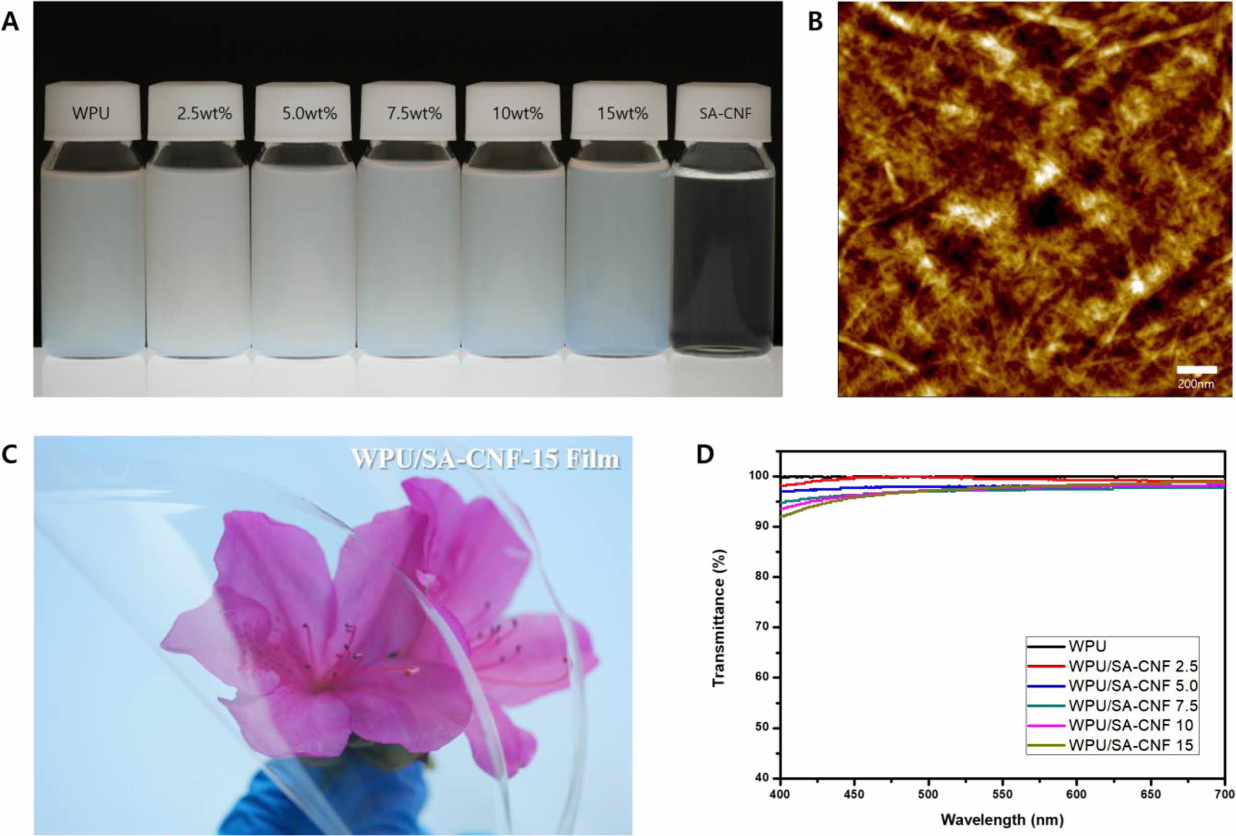 Figure 1 (A) Suspension blend of WPU and SA-CNF; (B) AFM topographic image of SA-CNF; (C) photograph of WPU/SA-CNF-15wt% film; (D) UV-vis spectroscopic analysis of WPU and WPU/SA-CNF composite films. |