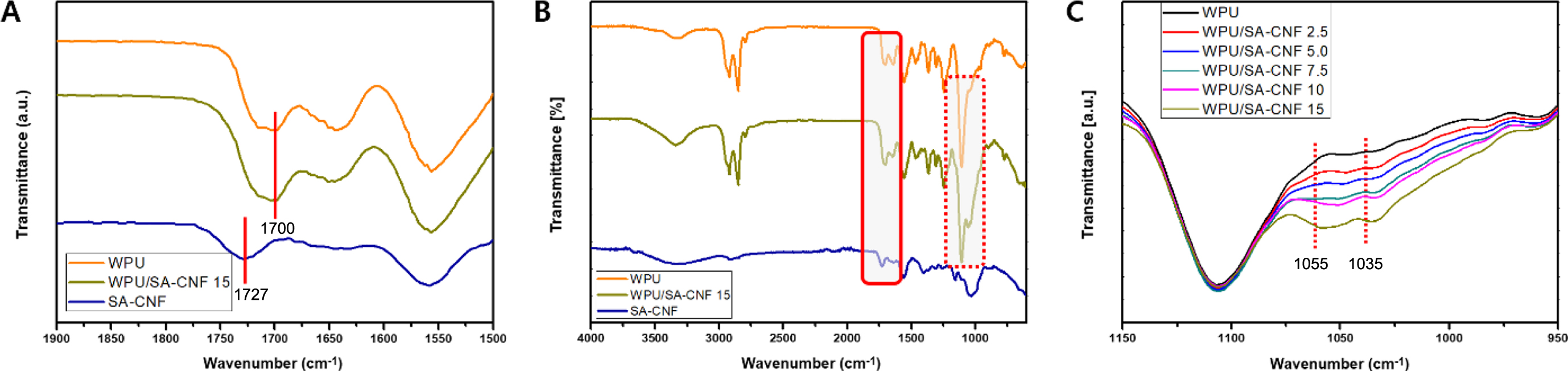 Figure 2 FTIR spectra of WPU/SA-CNF composite films: (A) 1500~1900 cm-1; (B) 600~4000 cm-1; (C) 950~1150 cm-1. |