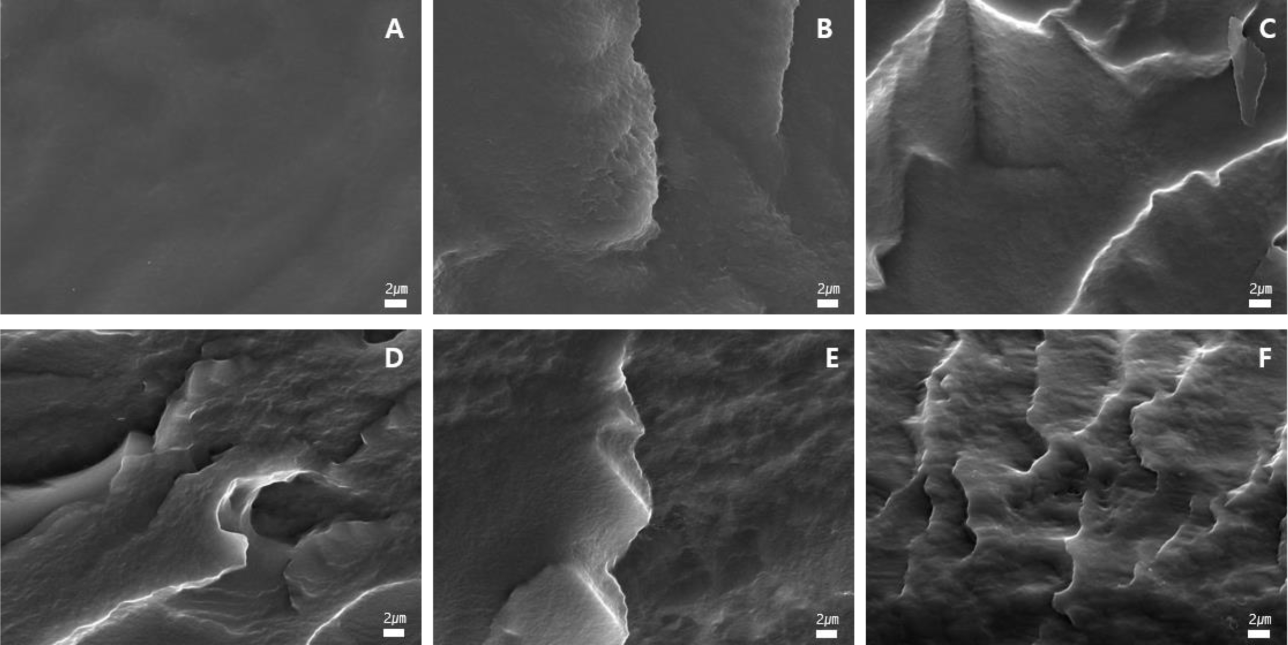 복합체의 미세구조를 분석하기 위해 SEM 분석을 진행하였다(Figure 3). WPU 단면의 경우 깨끗한 단면 이미지를 관찰할