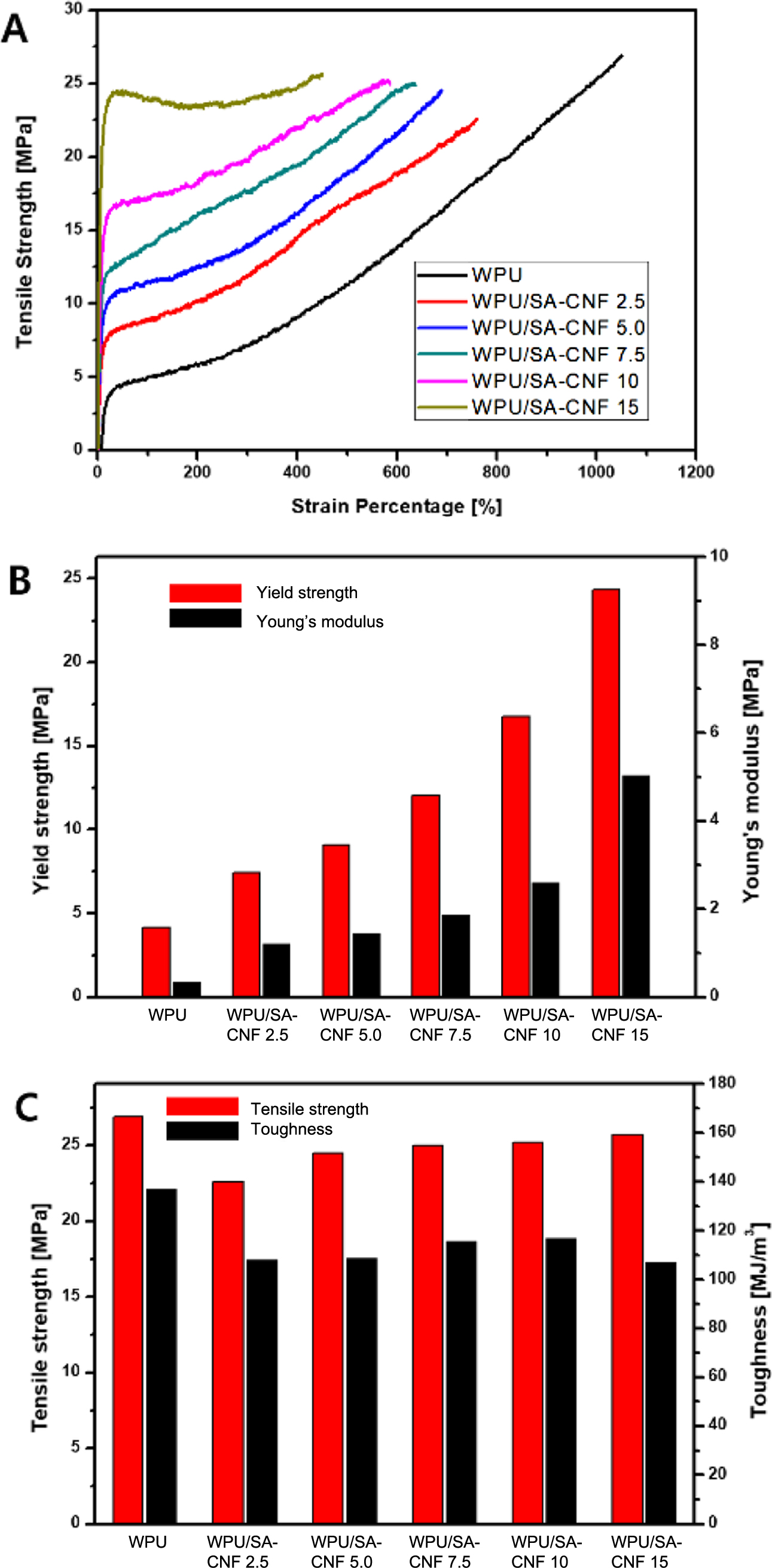 was confirmed that both the yield strength and Young’s modulus of WPU/SA-CNF