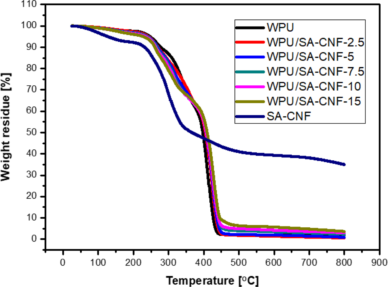Figure 7 TGA data of WPU/SA-CNF composite films. |