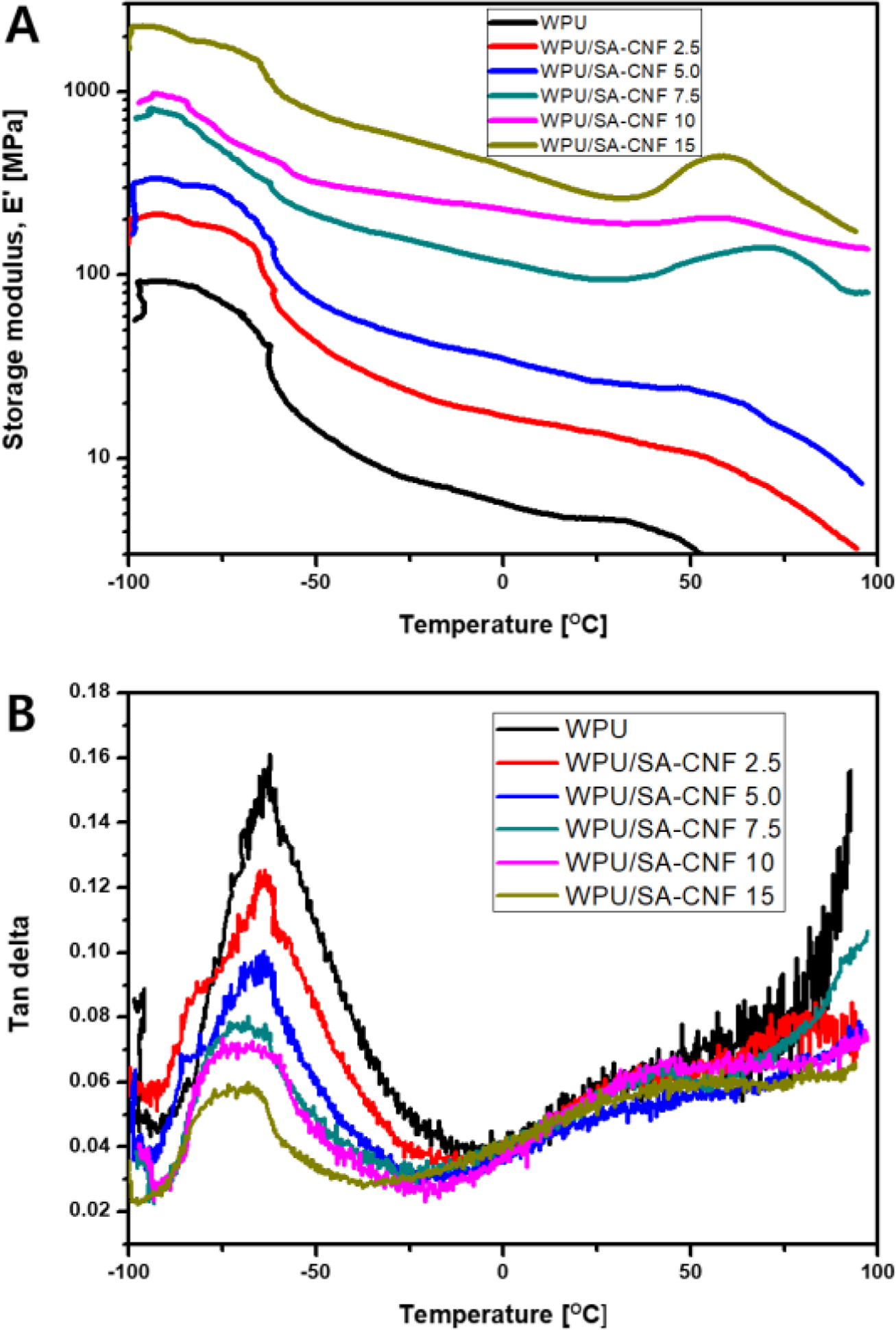 Figure 8 DMA data of WPU/SA-CNF composite films: (A) storage modulus; (B) tan delta. |