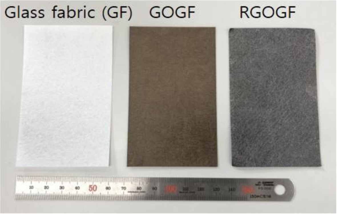fabric: GF), 그래핀 산화물 코팅된 유리 섬유(GO coated glass fabric: GOGF), 환원 그래핀 산화물 코팅된 유리