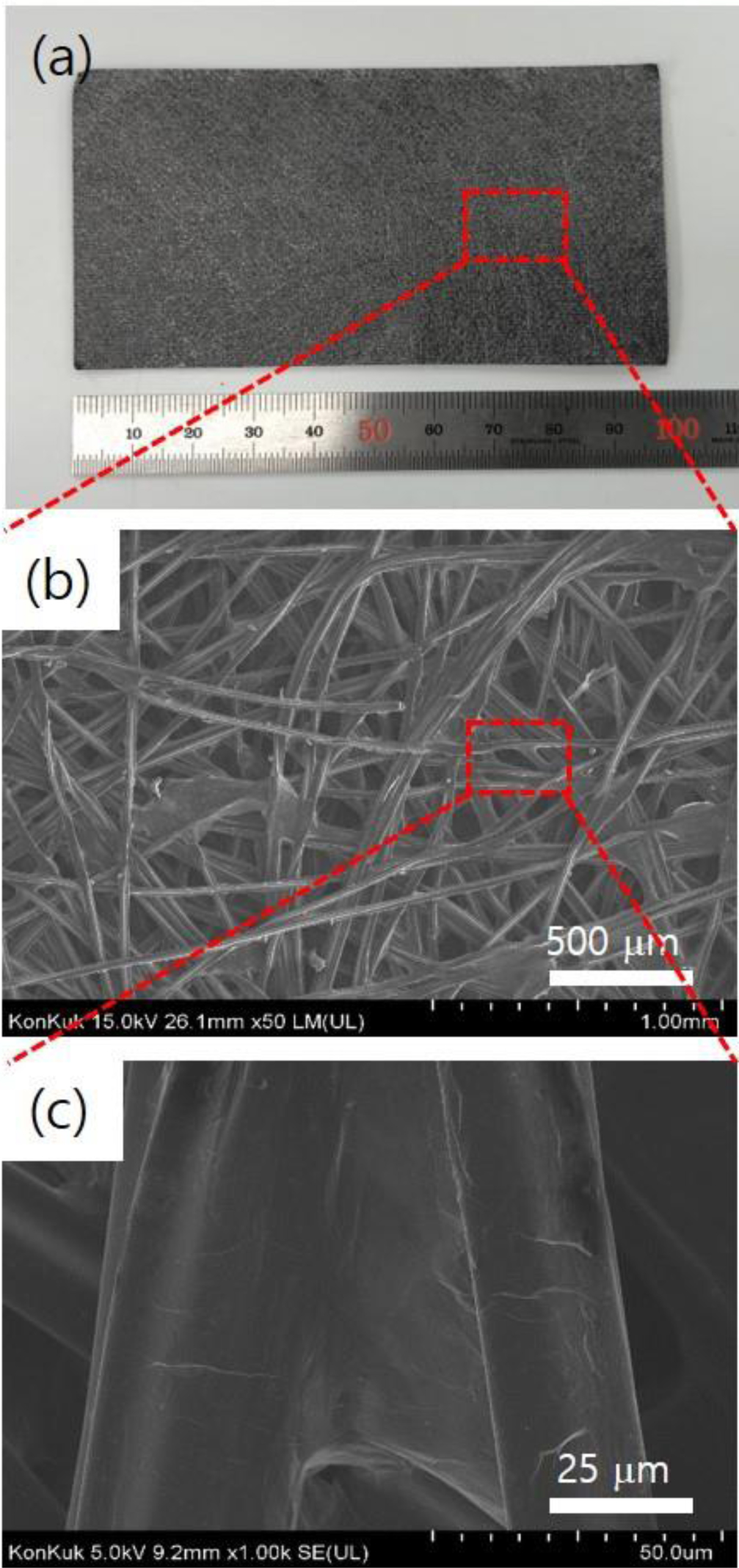 Figure 3(b)는 전자 현미경 분석을 통해 전형적인 유리 섬유의 형태를 확인하였다. 환원 그래핀 산화물이 코팅된 유리 섬유를 구성하는 각각의 화이버의