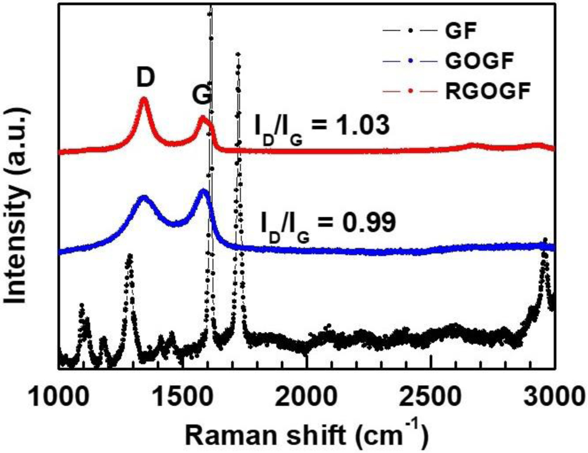 Figure 4 Raman spectra of GF, GOGF, and RGOGF. |