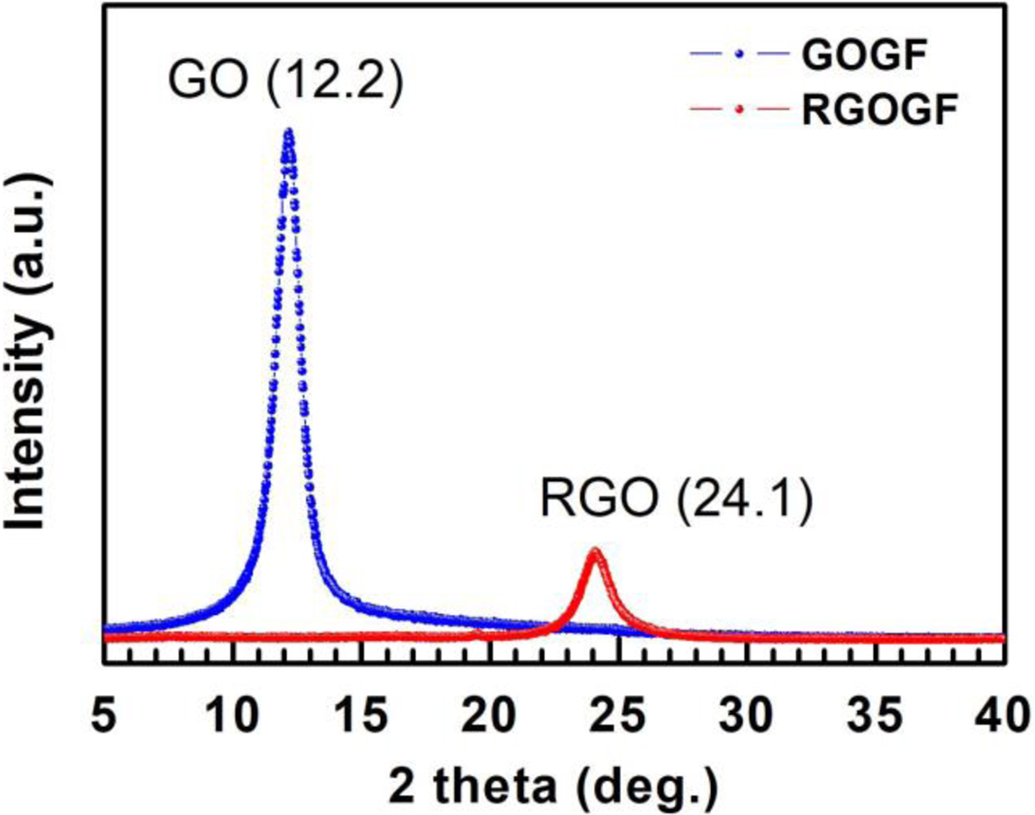 피크가 12.18° 근처에서 측정되었고(파란색), 이 값은 그래핀 산화물 층간 간격이 대략 10.1 Å로 예상된다. 환원 이후에는 24.1°로 크게 이동하였고, 이 값은 3.6 Å에 해당된다 (빨간색). 이 결과로부터 환원 이후에 유리 섬유 위에 코팅된 그래핀 층 사이의 간격이 크게 감소함을 알 수 있다.