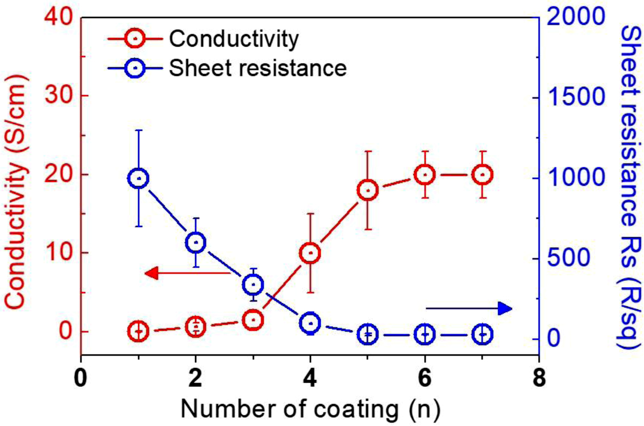 Figure 6 Electrical conductivity and sheet resistance of RGOGFs depending on the number of GO coating. |