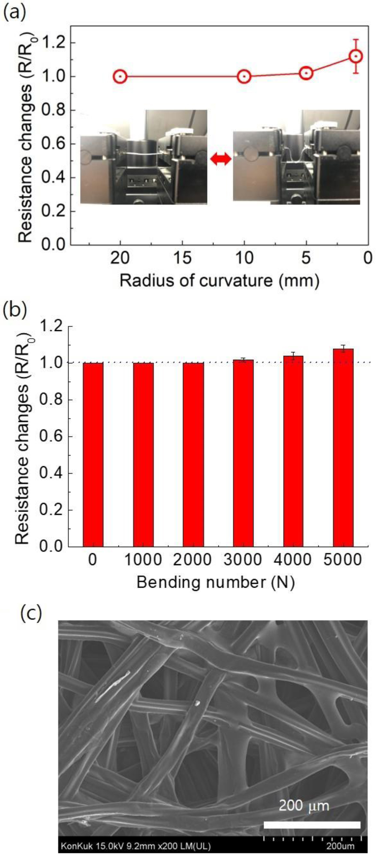전기적 저항의 변화가 있음을 확인하였다. 비록 5000회의 굽힘 테스트 이후, 약간의 저항이 증가하였지만, 굽힘 부분에서 손상들은 확인할 수 없었다(Figure