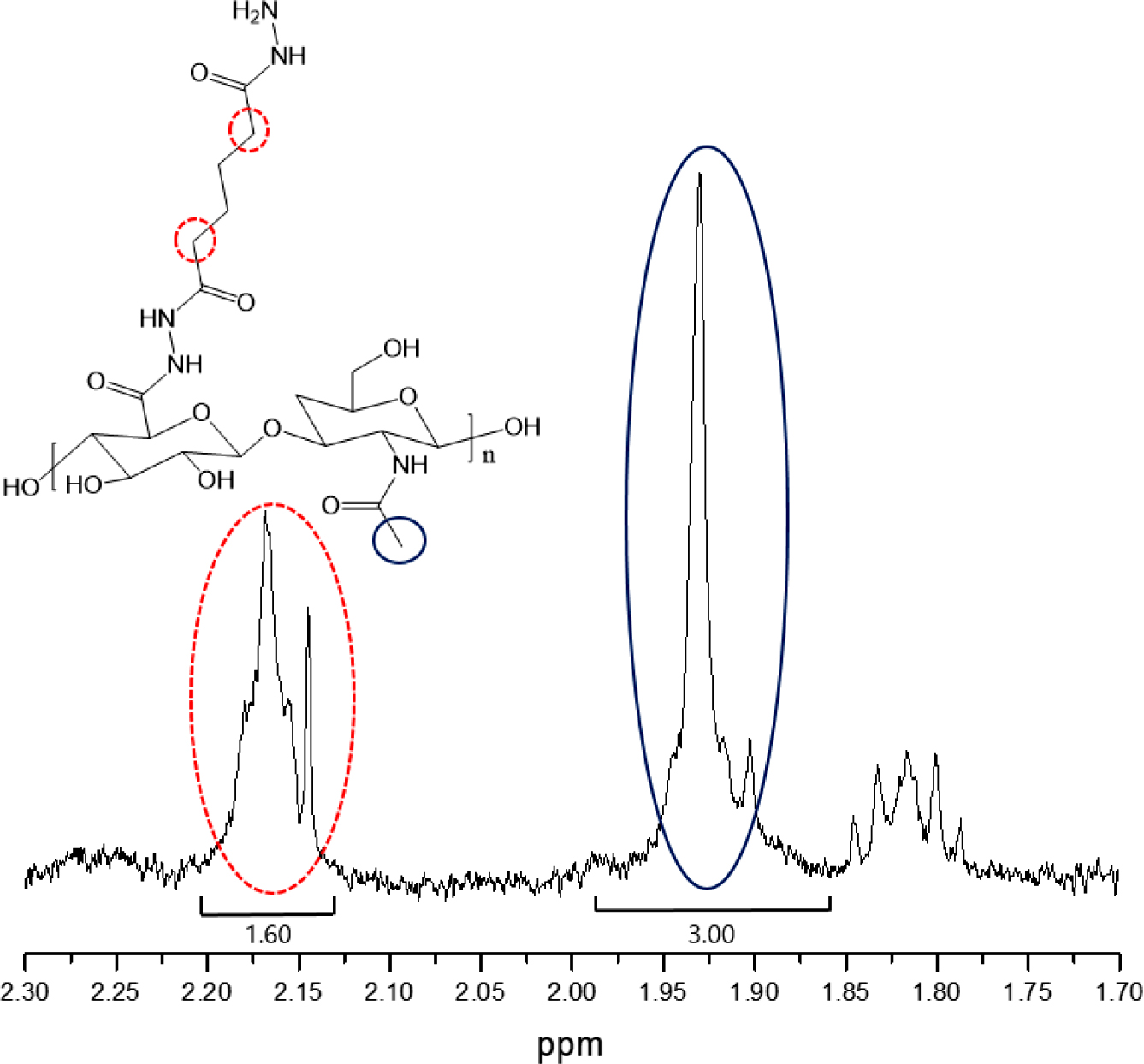 수정된 히알루론산의 핵자기공명분광법을 통해, 히알루론산에 adipic dihydrazide 치환된 정도를 확인하였다. 1.94 ppm에서 나타나는 히알루론산 acetyl 수소 피이크와