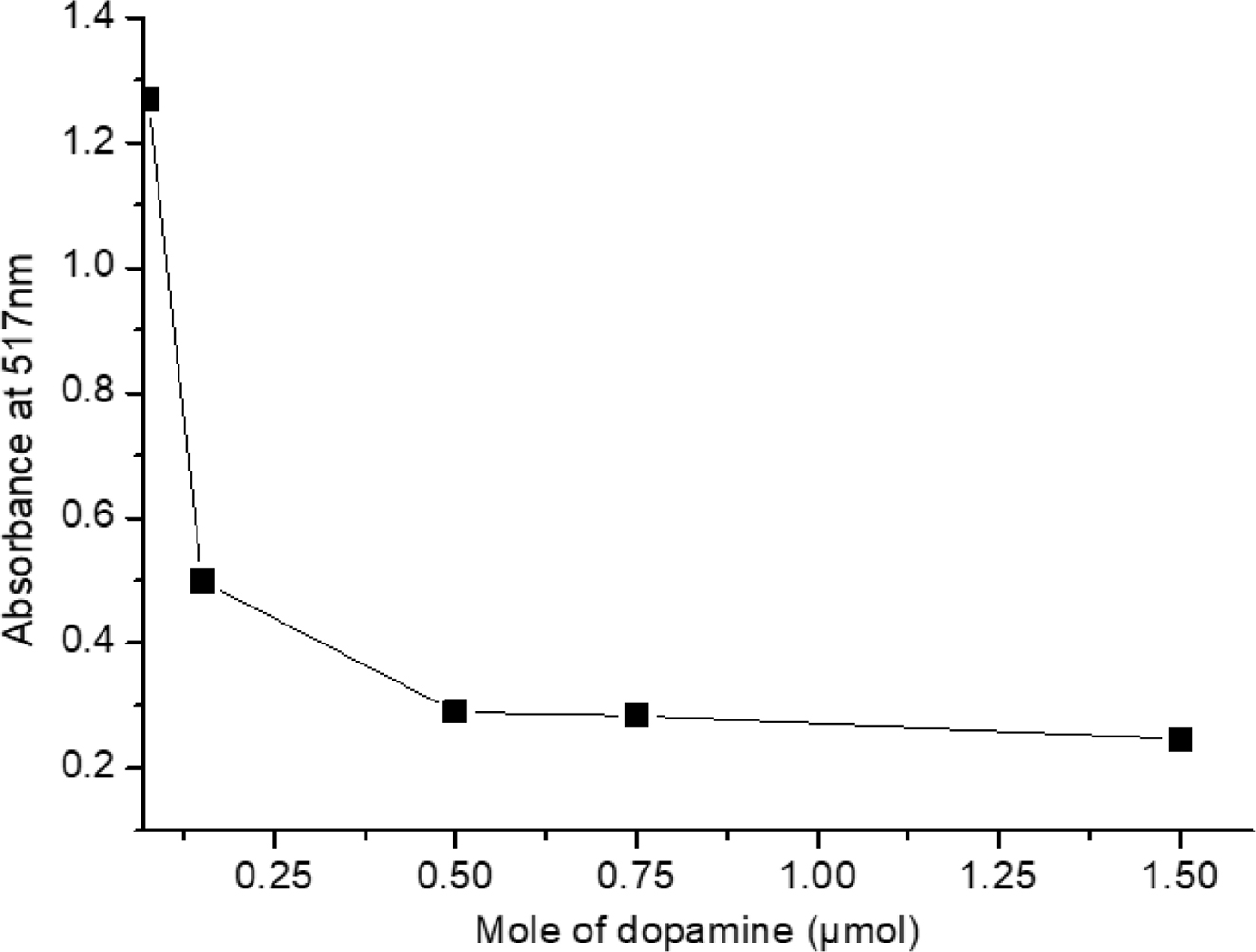 Figure 4 Variation of the absorbance at 517 nm as a function of mole of dopamine in the DPPH solution. |