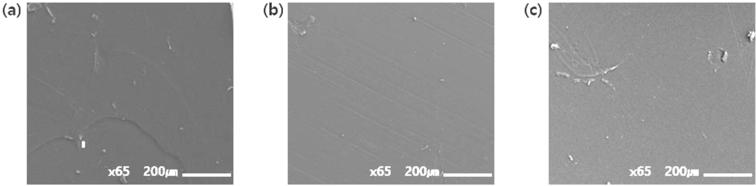 렌즈, HA-IPN 렌즈, Dopa-HA-IPN 렌즈) 모두 매끄러운 표면 특성을 보였다. 따라서 히알루론산과 도파민이 표면에 추가되었지만, 렌즈