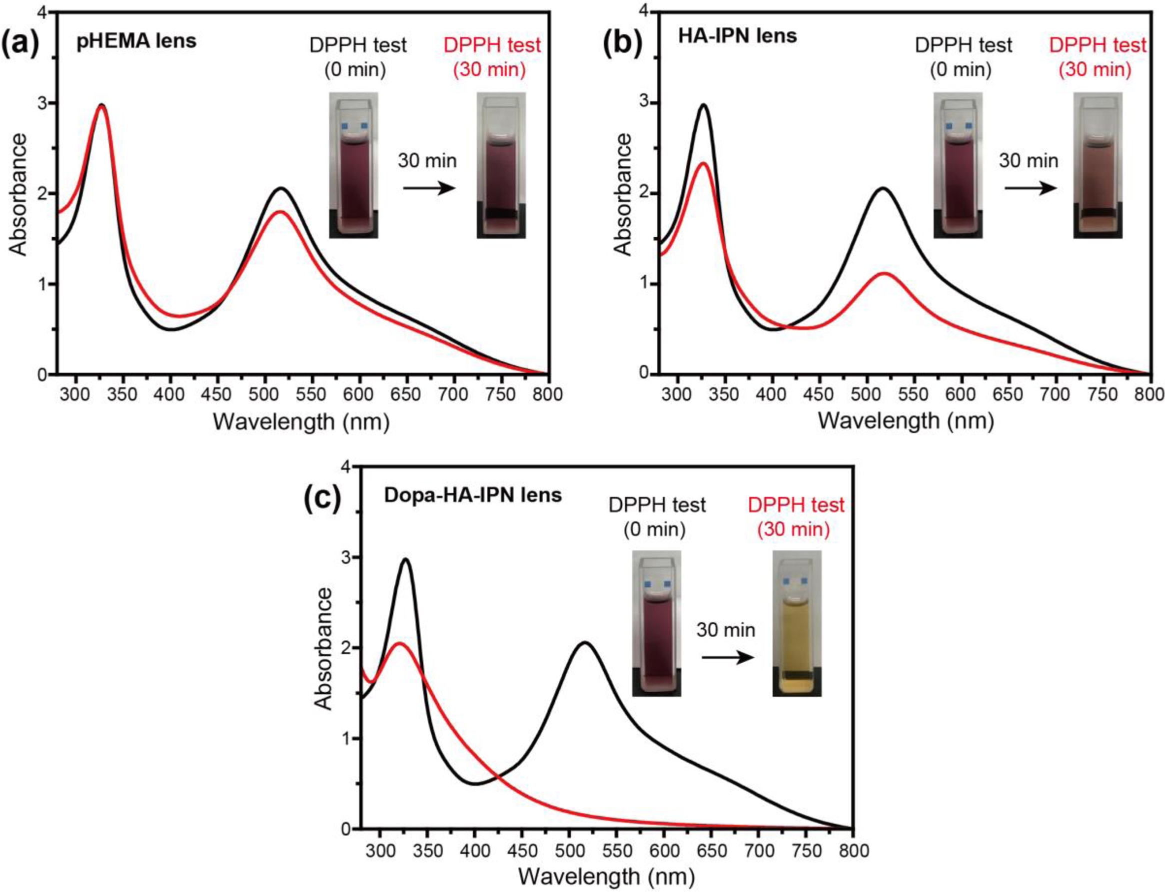 Figure 6 Absorption spectra and radical scavenging reaction in the DPPH solutions of (a) pHEMA lens; (b) HA-IPN lens; (c) Dopa-HAIPN lens. |