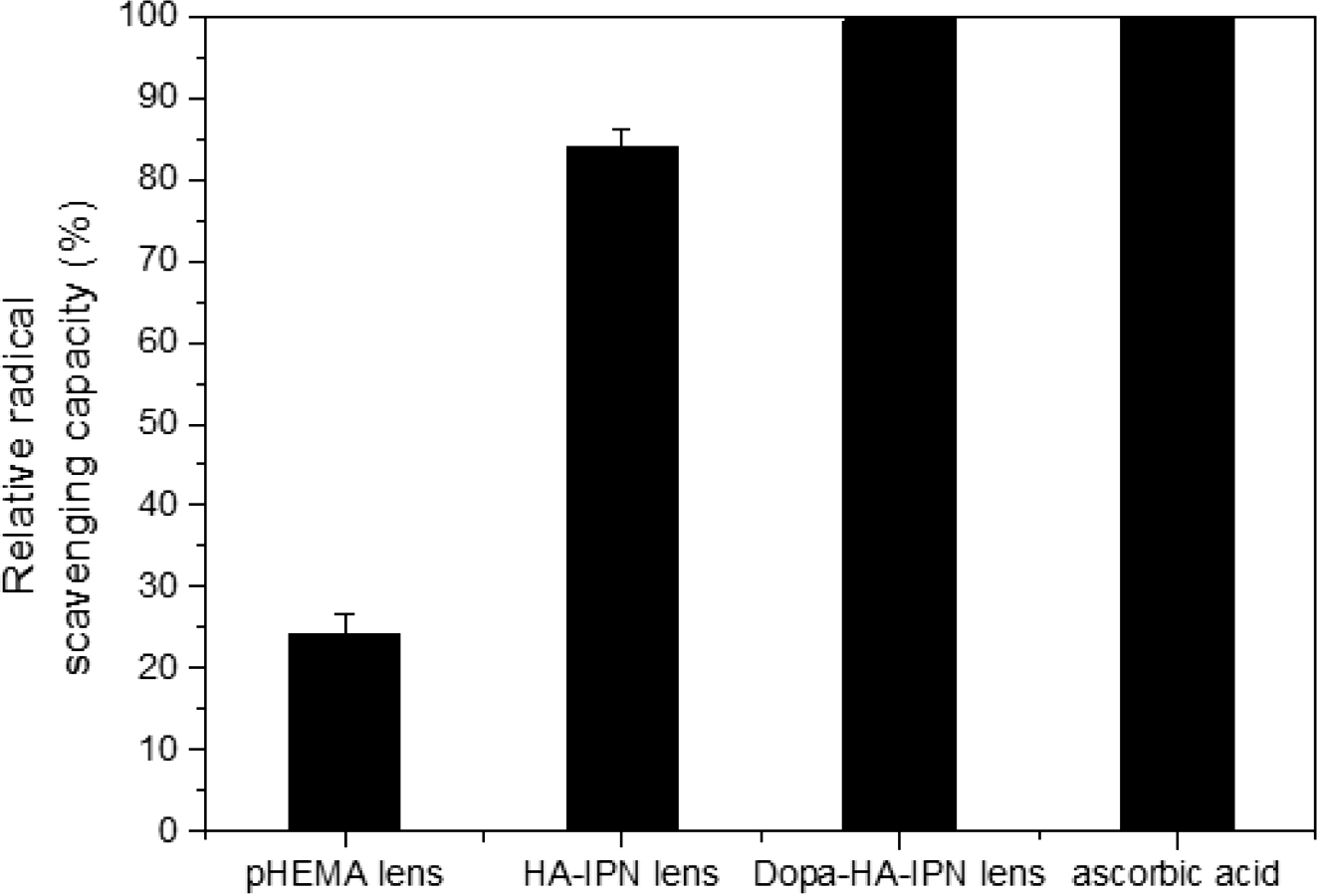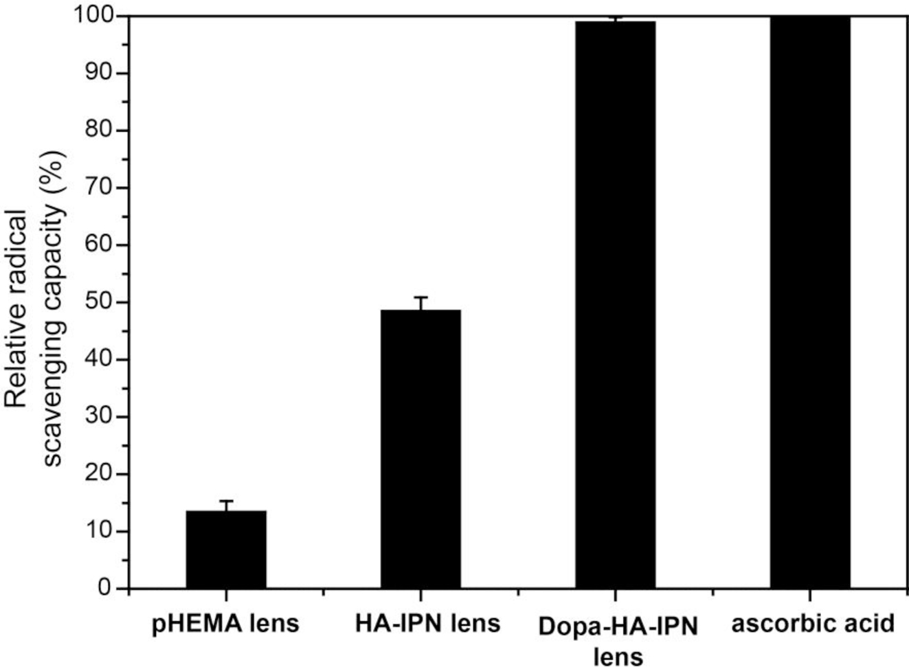 대비 콘택트렌즈들의 상대적인 라디칼 소거능을 Figure 9에 나타냈다. 아스코빅산의 소거율을 100%라고 가정하였을 때, pHEMA 렌즈와 HA-IPN 렌즈는 각각 24.2, 84.0%를 나타내었다. 한편, Dopa-HA-IPN 렌즈는 99.8%를 나타내어, 아스코빅산과 거의 동일한 항산화 기능을 보였다.