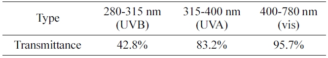 흡수가 일어나, 자외선 일부를 차단하는 것을 알 수 있었다. UVB 영역인 280-315 nm 범위와 UVA 영역인 315-400 nm 범위에서 각각 57.2%와 16.8%의 차단율을 나타내었다(Table 1).
