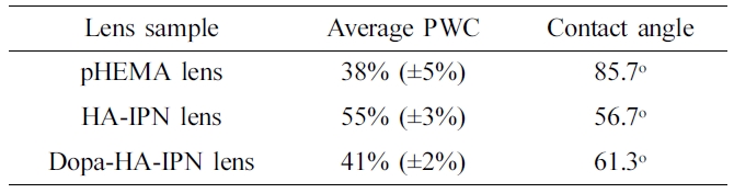 반면, HA-IPN 렌즈 및 Dopa-HA-IPN 렌즈의 접촉각은 60o 정도로 현저하게 낮아지는 것을 알 수 있었다(Table 2).