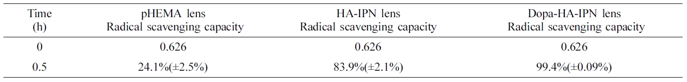 부착된 Dopa-HA-IPN 렌즈는 라디칼 피이크가 완전히 사라져 형태를 알 수 없었고, 92%의 높은 라디칼 소거율을 보였다. 이는