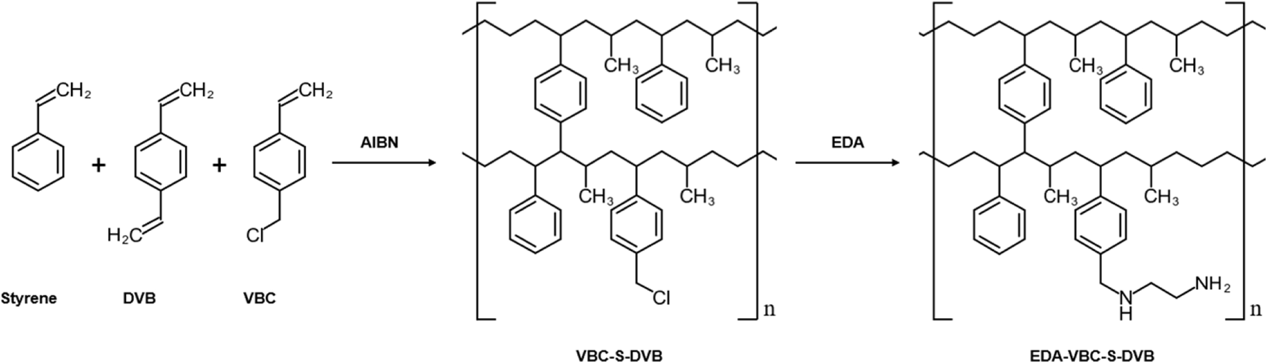 VBC-S-DVB를 제조하였으며 가교제 첨가량에 따라 두 종류의 시료를 준비하였다. 삼원 공중합체에 아민그룹을 도입하기 위하여 EDA를 사용하여 EDA-VBC-S-DVB 화합물을 제조하였으며