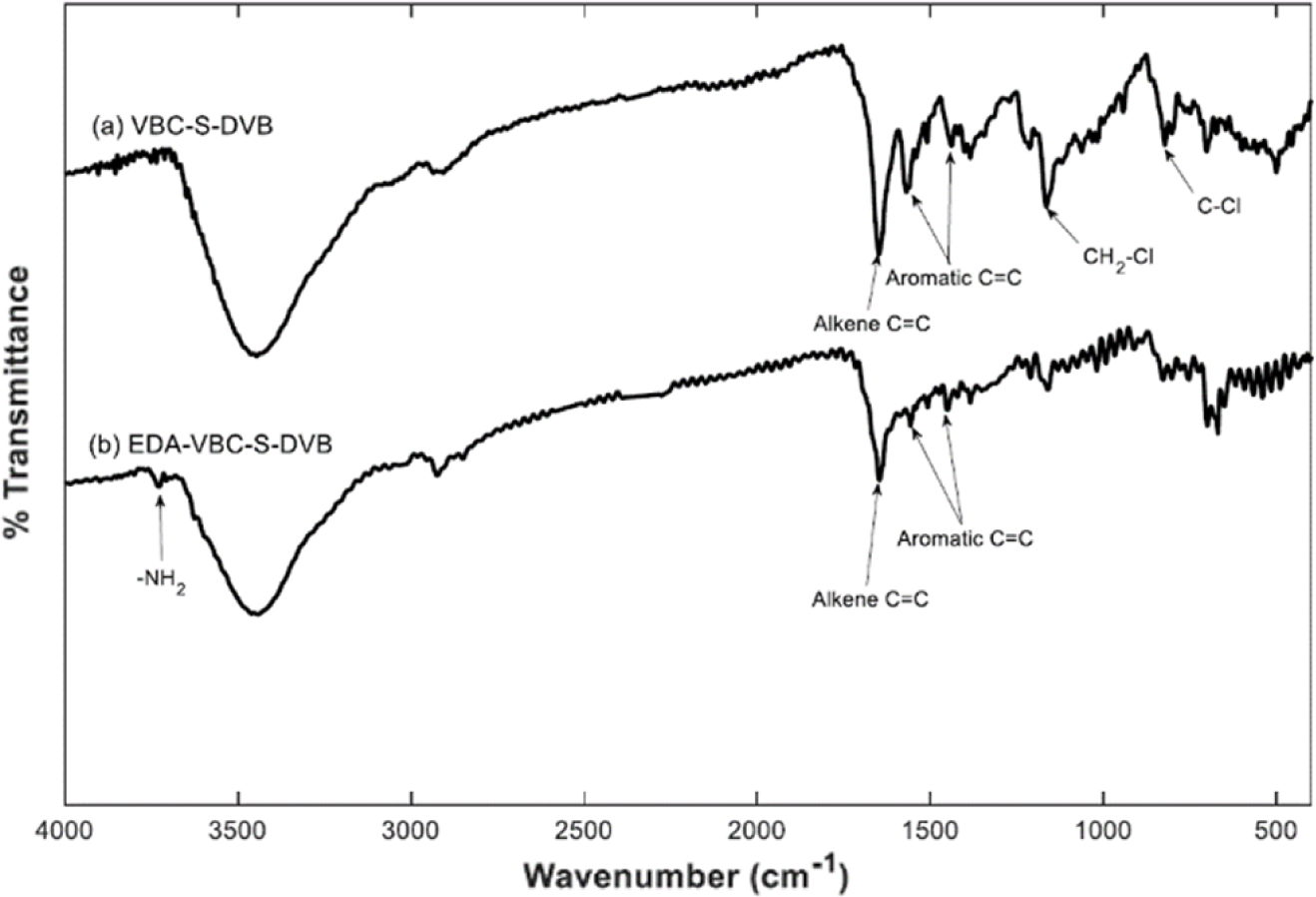 VBC-S-DVB 삼원 공중합체에 EDA를 사용하여 반응 처리한 EDA-VBC-S-DVB 화합물의 FTIR 스펙트럼이다. VBC-S-DVB에