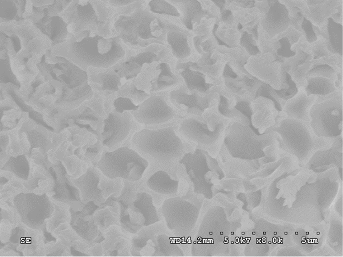 SEM 분석을 통해 EDA-VBC-S-DVB-2 화합물의 표면에 가교반응에 의한 기공들이 생성되었으며 이들이 높은 표면적을 제공한다는 것을 확인하였다.