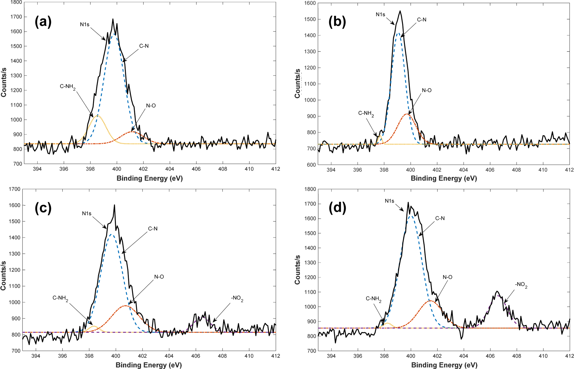 세기가 변화하는 것을 확인하였다. Figure 7(a)~(d) 모두에서 399.9 eV 부근의 C-N 피크가 가장 넓은 부분을 차지하고 있으며 NO 가스 흡착에 따른 결과인