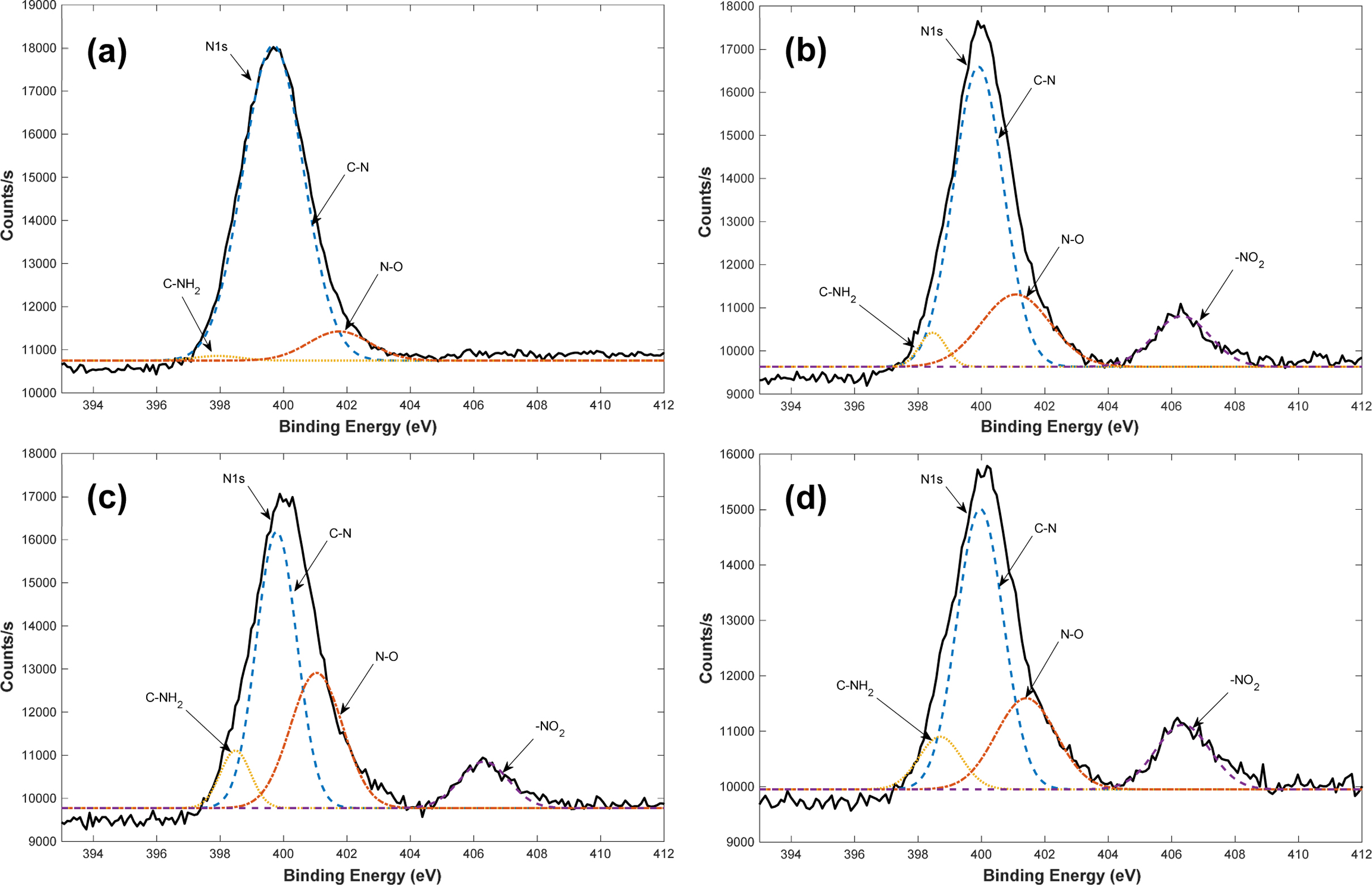 Figure 6 및 Figure 7의 XPS 분석을 바탕으로 각 요소 피크를 분석하여 얻어진 N-O 피크와 -NO2 피크의