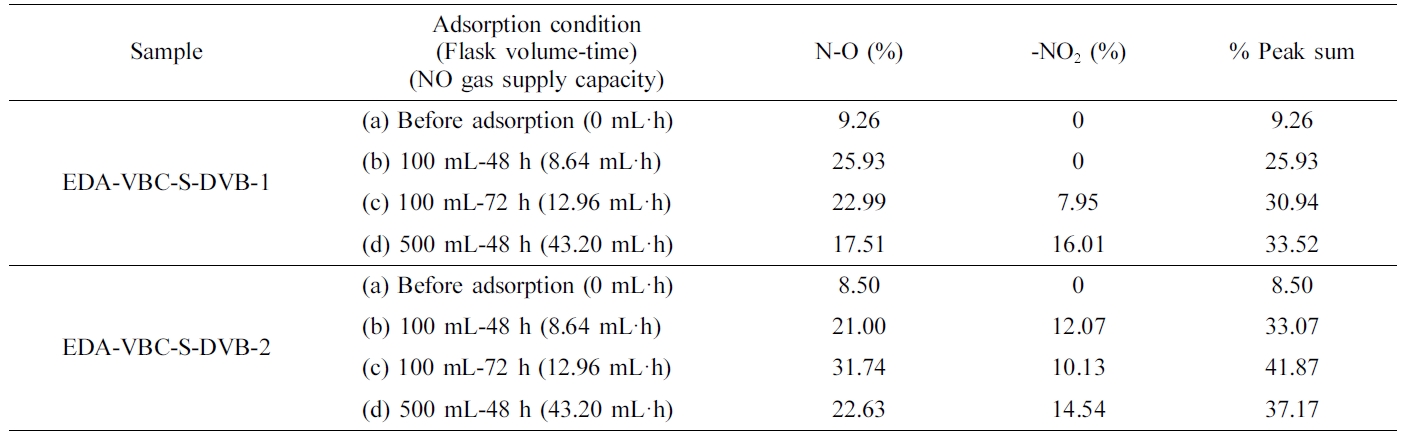 표면 상태를 확인하였으며, NO 가스 흡착 실험을 종료한 후 EDA-VBC-S-DVB 화합물에 남아 있는 NO 가스에 대한 정성 및 정량 분석을