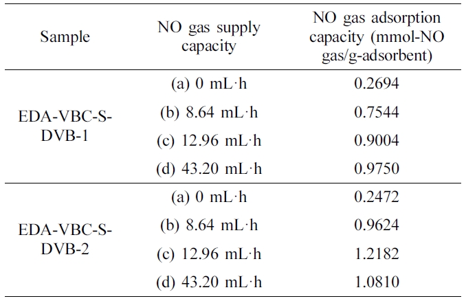 흡착용량이 증가하였으며 본 연구에서 제조한 EDA-VBC-S-DVB의 경우 NOx 가스 공급용량 임계치는 12.96 mL·h, NOx 가스 흡착용량 최대치는 1.2182 mmol/g,