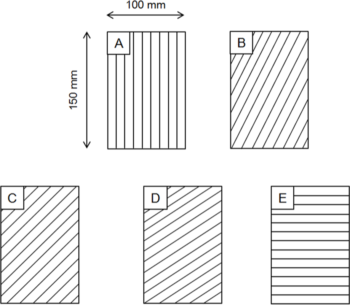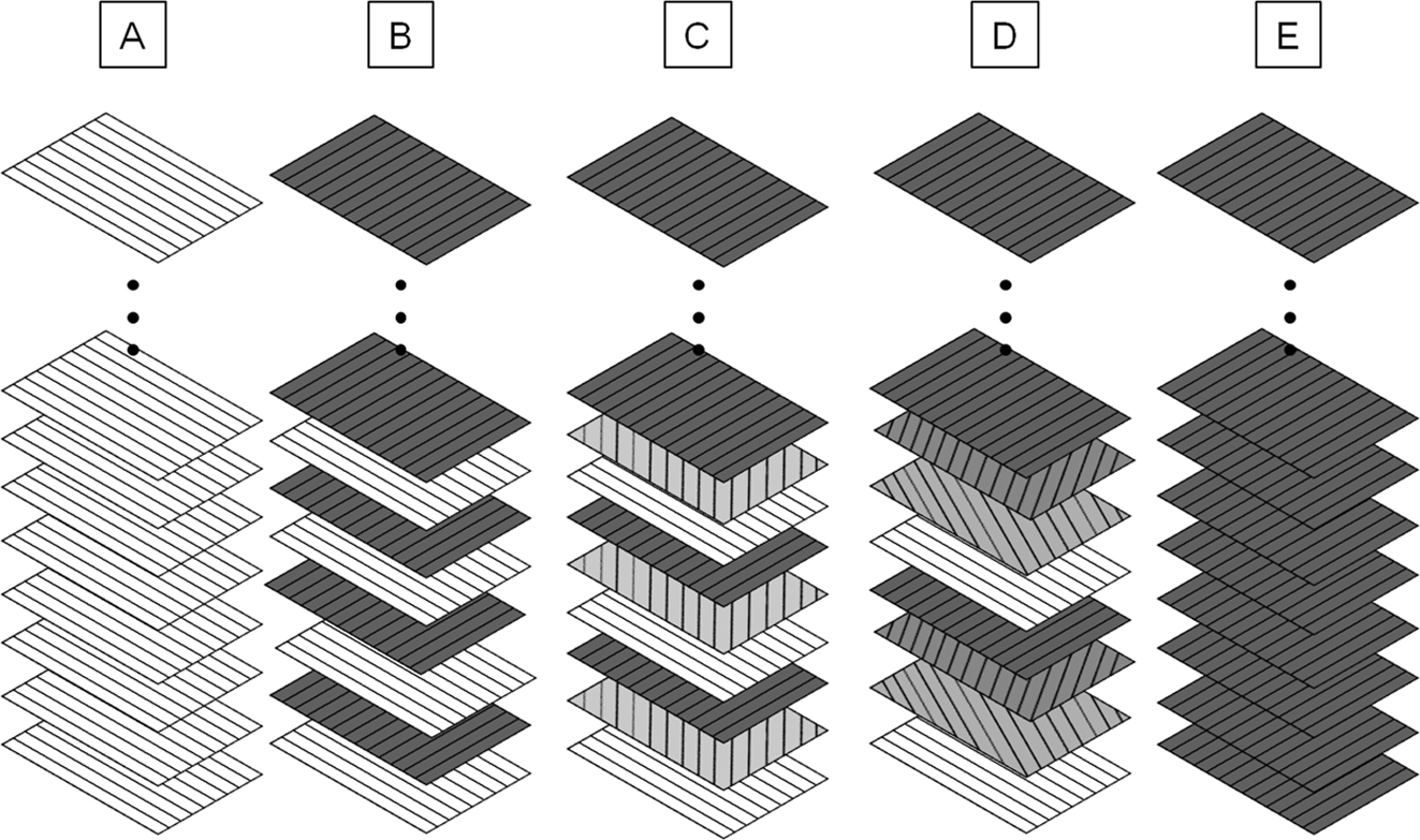 angle-ply를 변화시키면서 0° (A), 0°/90° (B), 0°/45°/90° (C), 0°/30°/60°/90° (D) 그리고 90°