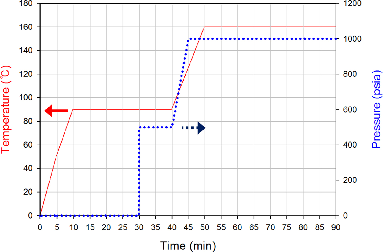 조건은 Figure 4에 나타내었다. 프리프레그 내 B-stage 상태의 에폭시수지가 탄소섬유에 충분히 함침될 수 있도록 90 °C에서 15분간 열과 압력을 가해준 후, 150 °C 성형온도와 6.9 MPa 압력 하에서 에폭시수지를 경화하였다. 압축성형 중 복합재료의 매트릭스 내에 보이드 형성을 최소화하기 위하여 압축성형 중